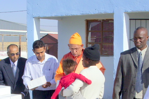 At 11 am he reached a School premises where more than 500 indigent Black/Indian people gathered. He gave away the hampers and also spoke a few words of consolation first in English and then for a few minutes spoke, to the delight of the aged people assembled there in Tamil and Hindi. In the evening, he visited the Ladysmith Sub-centre and prostrated at the beautiful shrine before the Holy Trio. He met devotees and also the newly initiated disciples and gave them spiritual guidance.