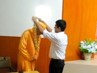 The programme commenced promptly at 19:00 hrs and the devotees were warmly greeted by sister Karistha Singh who was the Programme Director for the evening. After the initial proceedings, brother Akshar Sewrathan extended a cordial welcome to His Holiness Swami Vimokshanandaji Maharaj by garlanding him. Earlier at the entrance two sisters placed the holy tilak on his forehead in the traditional style.