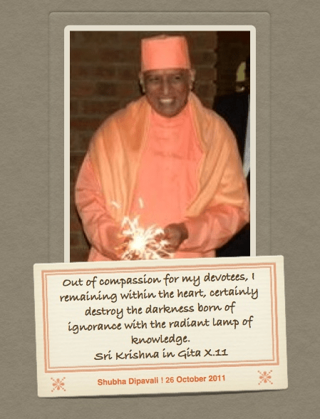 In the Bhagavad Gita, Bhagawan Sri Krishna says that out of compassion for the devotees, He, residing within their hearts, certainly destroys the darkness born of ignorance with the radiant lamp of knowledge. (Ch X.11). Hence, while celebrating Diwali, let us pray to the Divinity (in whatever form one may believe in) to bestow the right knowledge by which we can lead a peaceful and prosperous life with service to the poor and needy.