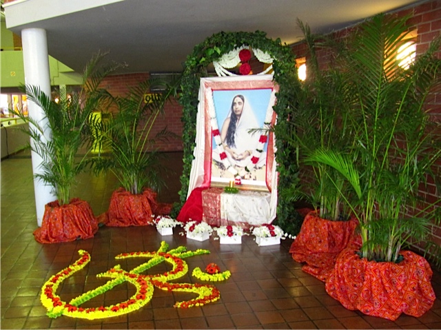 The clear skies and the Durban warmth presented a perfect backdrop for a Sunday morning of discussion on some of Hinduism’s sacred texts. The foyer outside T1, the venue of the Conference, was converted into a small shrine with a beautiful garlanded picture of Holy Mother Sri Sarada Devi surrounded by plants, bouquets and an artfully created ‘Aum’ symbol made with flowers. It was complemented by a slide show of spiritual quotations on a digital screen above the entrance.