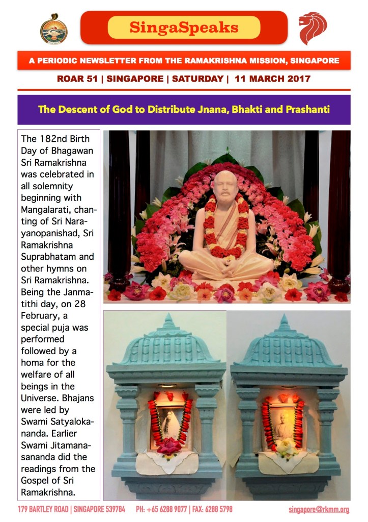 Roar 51 details the Birthday Celebration of Bhagawan Sri Ramakrishna with chantings, Readings, lectures and Homa. With a few pictures…
