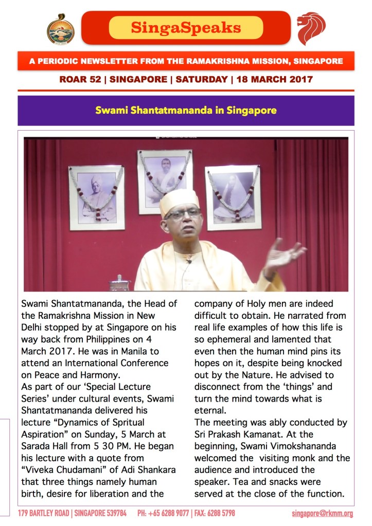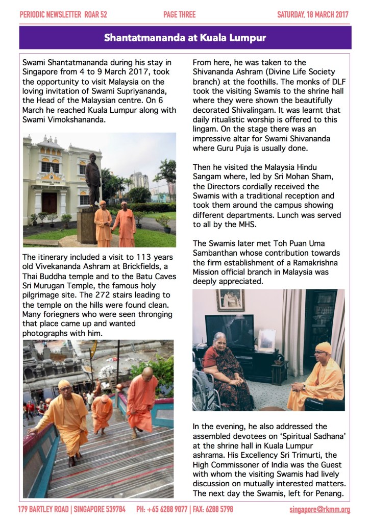 Roar 52 speaks about the visit of Swami Shantatmanandaji Maharaj to Singapore and two cities – Kuala Lumpur and Penang – in Malaysia…