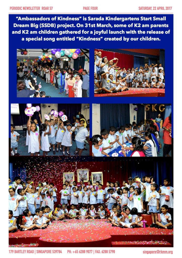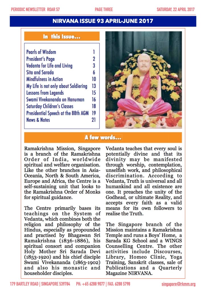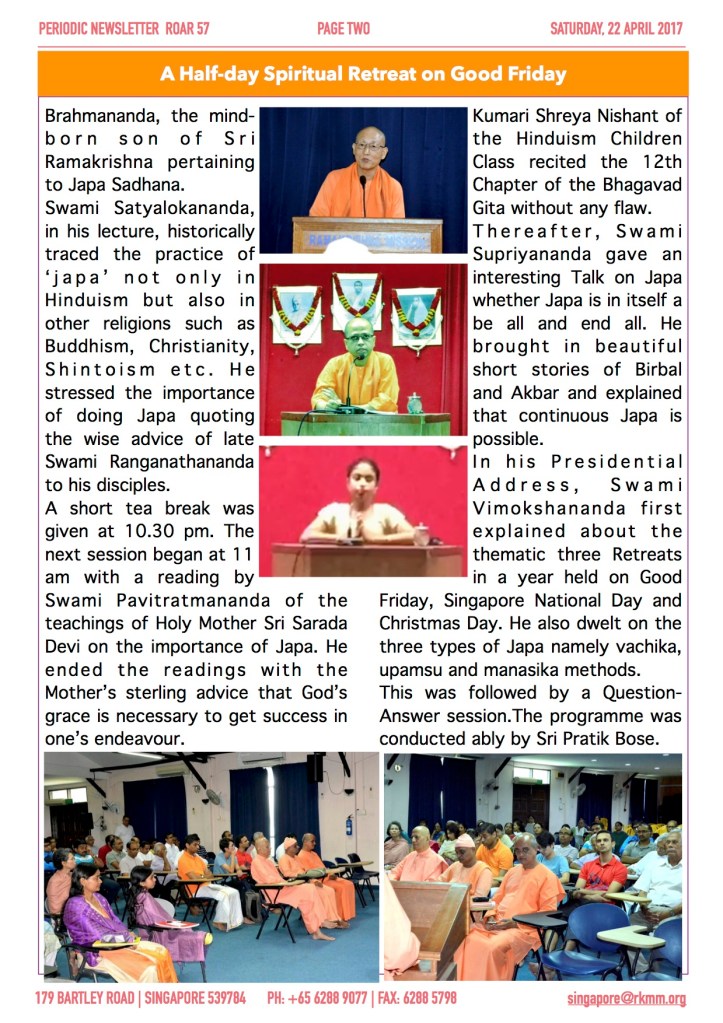 Roar 57 throws light on the Spiritual Retreat held at Sarada Hall on the 14th April 2017. Swami Supriyananda, the Head of our Malaysia centre was the Chief Guest. Also it has news of Sarada Kindergarten…