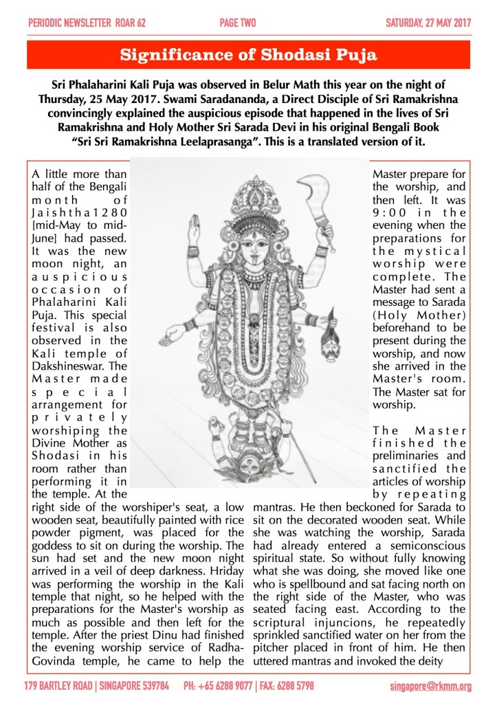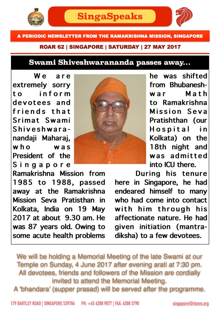 Roar 62 announces that Srimat Swami Shiveshwaranandaji Maharaj, who was President of the Singapore Ramakrishna Mission from 1985 to 1988, passed away at the Ramakrishna Mission Seva Pratisthan in Kolkata, India on 19 May 2017 at about 9.30 am.