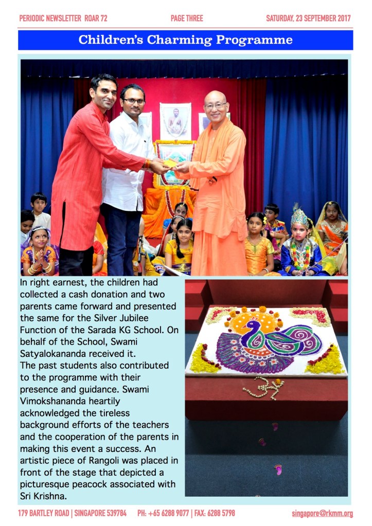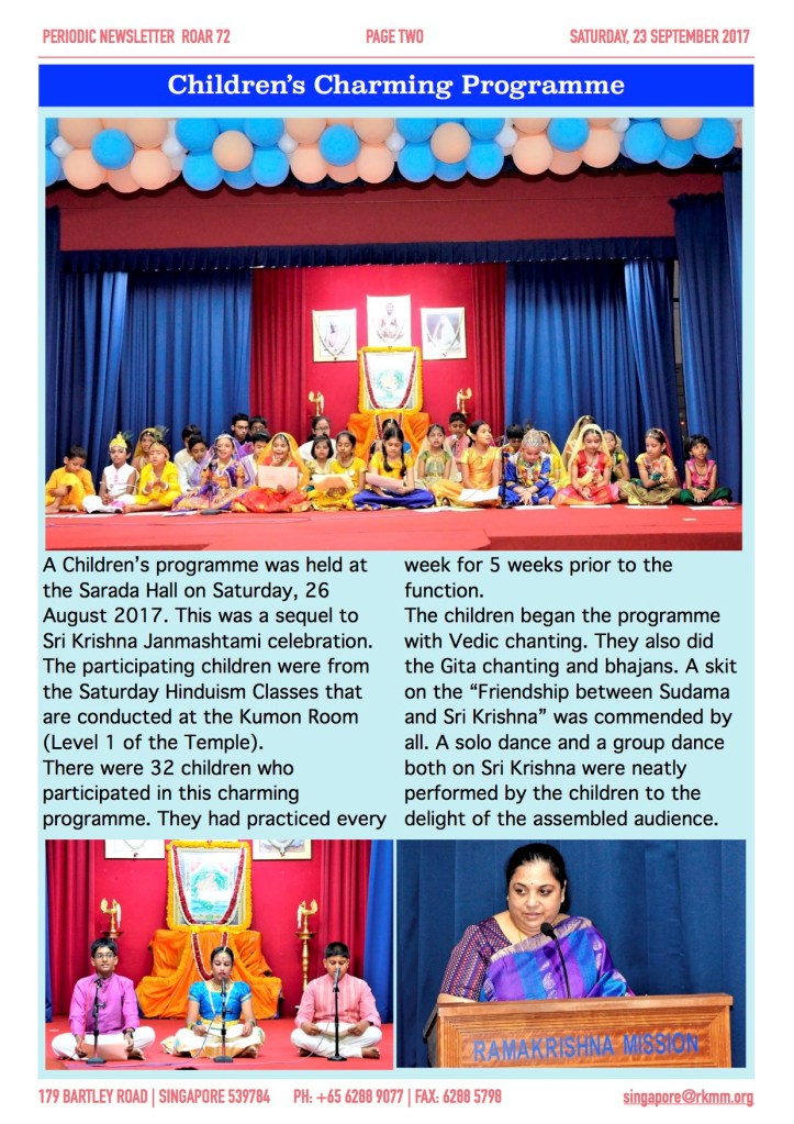 Roar 72 describes the two major functions – one Sri Krishna Janmashtami held on 14 August 2017 and another – a sequel to this function. The latter one was a Cultural programme where Children from the Hinduism classes participated…