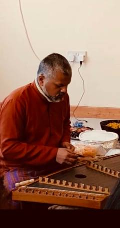 The multi-faceted qualities that Swamiji possessed included his deep interest in classical music like dhrupad, khyal etc is well known to everyone. He was also good at playing musical instruments like pakhawaj, tabla, violin, tambura etc. One music artiste Ashish Dha, specializing in Nada yoga in Dublin paid homage to Swamiji by singing the morning raaga Miyan ki Todi. He also played dhrupad and a little khyal to the delight of devotees in an Irish instrument Hammered Dulcimer somewhat likened to the Indian santoor. He charmed the assembled children by singing an English funny song playing with his guitar! A grand birthday cake was also offered lovingly by the children while singing the beautiful song “janmadinamidam…” in a chorus. About 50 people attended the function.
