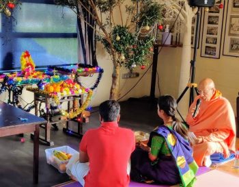 A recently married young couple from Karnataka was selected to do the puja rituals. Swami Vimokshananda was the tantra-dharaka of this puja, directing them to perform the rituals and chanting the mantras suitable to every act of propitiation. He explained the purport of this puja initially and went on giving an English rendering of the ritual practices. At the close of the Puja, the audience repeated with him the 108 names of Lord Ganesha in one voice. That created a wonderful vibration. The assembled devotees then gave the pushpanjali one by one.