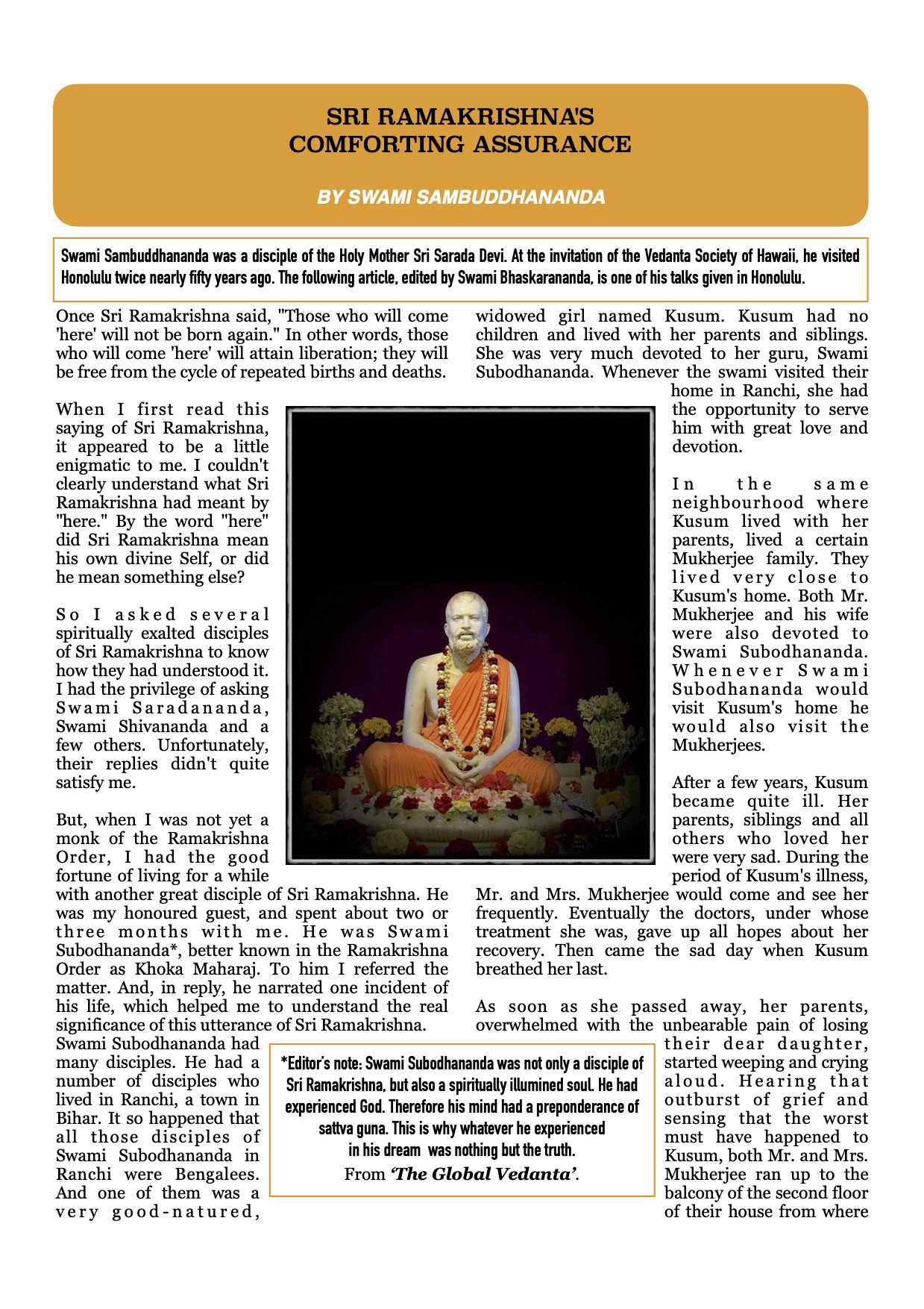 Indeed Kusum’s experience and the narration of that by Swami Subodhananda Ji Maharaj are like GPS for us, ordinary devotees. We may not have that much shraddha in Guru’s grace but one day we all can reach that exalted stage by performing sadhana as per Sri Guru’s instructions. This article confirms that a disciple need not have any fear of after-death situation.